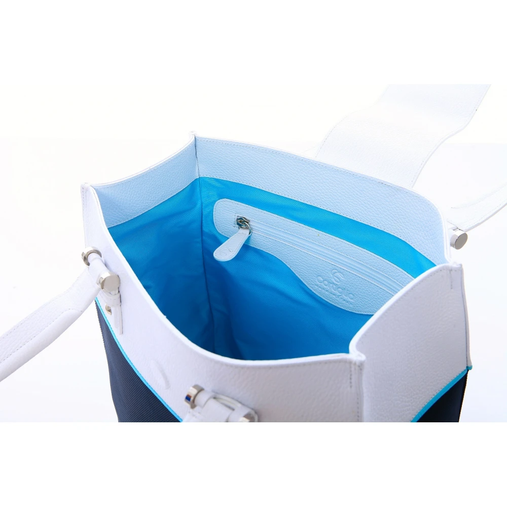The Rendezvous is our newest rendition of a stylish tote! More than just a tennis bag… The “Rendezvous” bag keeps you stylish from the office to the court to your after play lunch. Made in Italy, with the finest materials, the sturdy construction holds 2 racquets easily. Detailed in turquoise, with the finest craftsmanship, this bag clearly makes you look great, feel great & play great! The two outside pockets allowing easy accessibility for your cell phone and keys.