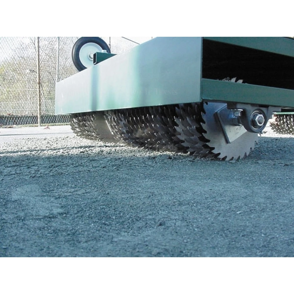 Circular steel blades mounted on a free-turning axle to agitate court surfaces without removing or damaging existing line tapes.