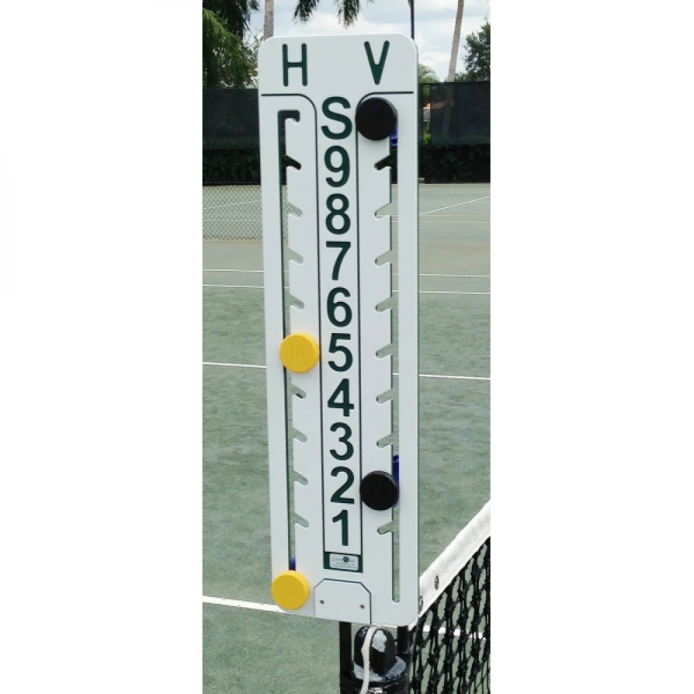The Love One tennis scoreboard has large numbers and bright colored indicators that make it easy for players, coaches and spectators to read from a distance. The board is manufactured from high quality polymer plastic that is built to last. It fastens easily to all types of net posts and scores 2-out-of-3 sets, 8 game pro sets for juniors and 10 point tie breakers.