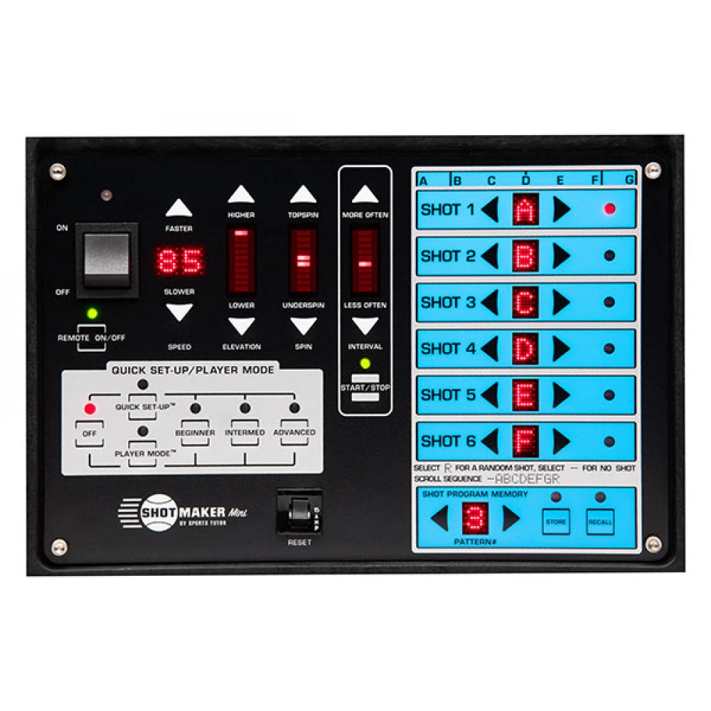 Shot Program Memory – Can be programmed to shoot balls in a pattern of up to six shots, with each shot directed to any of seven different court positions, or to a random position. Up to eight shot sequences can be stored, and then recalled any time with the touch of a button.